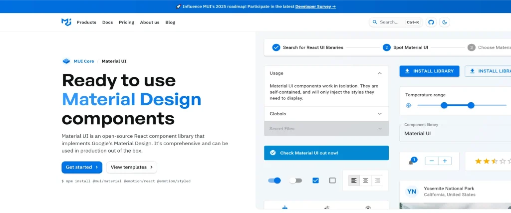 With over 90.8k GitHub stars and 31.1k forks, Material UI is one of the most popular React libraries. It offers pre-designed themes, a rich component set, and detailed documentation, making it an excellent choice for developers—even those without design expertise.